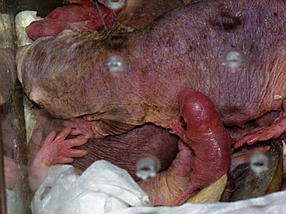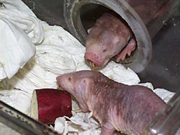 11月11日の朝,重なりあった群れの中に小さなうごめくものを見つけました。出産したのです。出産には数時間かかるようで,粘膜におおわれた小さな物体が産み落とされるのを,自分の目で観察できたのは幸運でした。最終的に11頭の子を確認しました。新生児は赤裸で(親にも毛がないのであたりまえです),目も開いていません。げっ歯類の中でも妊娠期間が約70日と比較的長いテンジクネズミやマーラなどは,生まれたときはすでに親のミニチュアといえる姿をしており,親がいなくても動き回れます。ハダカデバネズミは,さらに妊娠期間が長いのに,見た目には未熟な状態で生まれてきます。 しかし子供たちには思わぬ能力がありました。這い回る能力にたけているのです。ときには長さ90cmのアクリル管の端から端まで這っていきます。巣から離れたプラケースに入り込んで戻れなくなると,ときおり回ってくるハウスキーパーにくわえられ,巣に戻されます。おとなの集団は子供がいてもおかまいなしに固まって寝てしまいます。子は踏みつけられたり,おとなたちの間に挟まれたりして身動きが取れなくなります。運悪く,寝ているおとなの下敷きになった子は,脱出しようと懸命にもがき,隙間ができると上に向かって這い上がってきます。もちろん乳を出すのは女王だけです。その女王は集団を布団代わりにして,一番上に「君臨」していることが多く,そこまで這い上がってきた子だけが乳にありつけるわけです。 子が生まれてから,今までと違った行動が見られました。餌を取り替えるときに,大きめの個体がアクリル管の入口に集まり,重なり合ってまるで巣にふたをするような動きを見せるのです。彼らにとって飼育者による給餌や掃除は,群れの平穏を破る行為に過ぎません。おそらく外敵の侵入から子を守るために,ソルジャーの個体が初めて見せた仕事だったのでしょう。 誕生6日目,繁殖成功の手応えを感じ始めた頃になって,突然数頭の子が死亡しました。そして,その後約30時間のうちに,なすすべもなく全頭が死亡してしまいました。子にはすでに特徴となる切歯がはえており,その成長が見られなかったことは非常に残念でした。群れ全体が落ち着いた状態でないと授乳ができないことなどを考えると,繁殖のための飼育環境としては不備な点が多々ありました。展示場のガラスをたたかれるだけで,群れは落ち着きをなくしてしまいます。この経験を次の機会を生かし,ユニークなハダカデバネズミの繁殖成功をめざしたいと思っています。 |