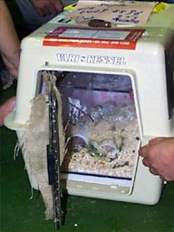 収容したトンネルシステムは内径4.5pの透明なアクリル管を市販のプラケースでつないだものです。職員自作のトンネルシステムの総延長はアクリル管の部分だけで約8mになりました。ここに10頭を放してみると,体温もあがってきたのか,元気の出てきた個体から順に動き始め,初めて使うトンネルを確かめるように探索していました。しばらくすると,走るものも出てきましたが,思っていた以上の速さです。トンネルで鉢合わせをすると,どちらかが体を低くし,片方がその上を通ってすれ違います。あるいは相手の体の下に潜り込もうとすることもあり,この場合は上になった個体がじっとしています。 トンネルの中で進む方向を変えるときは,体をよじって向きを変えます。小さな個体は楽に方向変換できますが,大きな個体は一苦労です。ところで,進む方向が前か後ろしかないトンネル暮らしのハダカデバネズミには,特殊な能力が備わっていました。後ろ向きに,しかも前進とほとんど変わらない速さで走れるのです。ゆっくり歩くことはあまりなく,前後ともにせわしく走ります。他の動物では見たことのない動きにも,デバネズミのユニークさを感じました。 この装置でハダカデバネズミを飼育すると,最も頻繁に見られる行動は,名の由来となっている異常に大きな切歯(前歯)で,アクリル管の面やプラケースの角をガリガリと削ることです。透明なアクリル管は無数の細かい傷で数週間もかからずに曇ったアクリル管 になってしまいました。プラケースの角も月に1か所は穴をあけられる始末です。 音の対策は次のようなものです。まず床からの振動を減らすため,トンネルシステムを乗せてある台の足にはゴムの板を敷きました。まわりの音の刺激に慣らすため,音楽を常に流すこととし,CDプレーヤーを繰り返すようにセットしました。2か月もたたずにCDプレーヤーは壊れ,その後はラジオを流しつづけています。計算外だったのは,動物園に隣接する大学が文化祭期間中のある夜,花火を打ち上げることでした。防音対策をとろうにも,このときばかりはどうにもなりませんでした。建物が振動するたびに,アクリル管の中で右往左往する群れを見るのはつらいものがありました。 施設には必須条件が多いのですが,飼料は実に