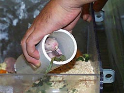 簡単なものです。バナナやリンゴ,サツマイモ,ジャガイモ,ニンジン,小松菜,それに市販のげっ歯類用のペレット(固形飼料)です。食べる量は体に比較して非常に少なく,一日で10頭がわずかに35g ほど食べるだけです。体重が半分しかないハツカネズミでももっと食べます。これはハダカデバネズミが体温を維持するエネルギーを必要としないためでしょう。水は与えていないので,水気の多いものを選ぶかと思いましたが,いちばんの好物はバナナでした。ニンジンやジャガイモはあまり食べません。甘くて柔らかなものが好きなようです。 ●アリやハチのような社会生活 ハダカデバネズミは姿も特異ですが,もっとユニークな点はその種社会にあります。彼らの社会はアリやミツバチなどの昆虫のように,繁殖する個体と,働くだけで繁殖しない個体が分化しています。来園したときに体重を計ったところ,最小の個体が34.6g ,最大の個体が69.8g、平均では44.7g でした。ひときわ大きな個体は,この群れの中でたった1頭,子供を生めるメスで「女王」と呼ばれます。繁殖に関わるオスも限られており,大きな群れでも数頭といわれています。この群れではどの個体か確認できていません。女王の半分ほどしか体重のない4〜5頭は「ハウスキーパー」と呼ばれる,いわば働きアリにあたる階層です。そして,ハウスキーパーより大きな個体が「ソルジャー(兵士)」と呼ばれる階層にあたります。ハダカデバネズミは3つの階層に分かれ,それぞれが役割をこなして,社会を営んでいます。 閉鎖的な穴の中で何代も近親繁殖を繰り返すので,群れの個体は遺伝的に非常に似通っています。ほとんどの個体は一卵性の双子ほどではないにせよ,人間の兄弟よりはずっと近い関係です。だからこそ,非繁殖個体にとって,女王の子供の成長を助けることが,自分の遺伝子を残すことにつながるのです。 巣材用のトイレットペーパーを,長さ50〜60pにちぎり,巣にしているプラケースから離れたプラケースに入れるとハウスキーパーがやってきます。長い紙を引きずって巣に運ぶとき,ついでにアクリル管の中も掃除してくれるので便利です。もちろんその作業にソルジャーと女王は加わりません。ソルジャーは,外敵などが巣に侵入してきたときに戦う階層です。戦う相手のいないアクリル管の中では,特に何もすることがないようでした。 ●ひたすら這い回る子供たち 来園して50日がたった8月30日,女王にマウントしている(交尾姿勢をとる)個体がいるのに気づきました。10月初旬には女王の腹部が目立つようになり,妊娠への期待が高まります。腹部が大きくなった女王は,アクリル管の中で他の個体とすれ違うことができなくなり,妊娠末期には体をまっすぐに向けてからでないとアクリル管に入ることもむずかしくなりました。植物食のハダカデバネズミはウサギのように2種類の糞をします。普通の黒い糞と粘液のような糞で,おそらく目的もウサギと同じで,食物の繊維質を効率よく利用する方法と考えられます。各個体は自分の出すものだけでなく,他の個体から粘液状の糞をもらっているのもしばしば観察されます。妊娠末期の女王は体が曲がらず,自分の粘液糞をまったく利用できなくなり,他の個体頼みとなっていました。