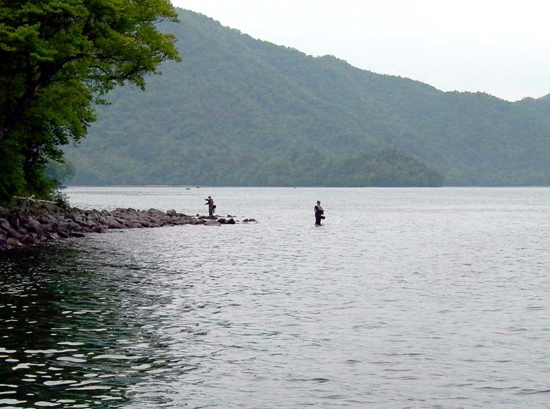 朝方の国道側は2週間前と比較すると水の動きが少ない雰囲気である。全体的によどんだ感じで水温が高いこともありライズも少ない。また、水温より気温が低いため湖水から湯気が立ち昇ってそれが靄のように立ち込めていた。早朝のゴールデンタイムは約4時間AM4:00からAM8:00が一区切りでその後一時釣れづらくなる。当日はレッドコア18lbに角ルアーとミノーで攻めるが釣れたのは小型のホンマス2匹とヒメマスであった。