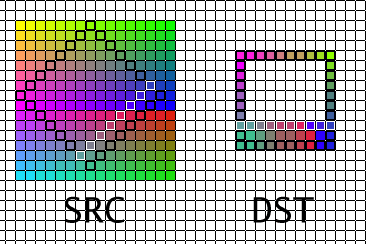 この回転は、4頂点の座標を変換し、それぞれの辺に対してブレゼンハムを適用することで、 描画することができます。 実際のプログラムでは変換の際の誤差がつきまとうので、 このように回転することでさえも意外に難しかったりします。 話を簡単にするため、このように回転できたとして、 矩形の回転複写をするために、 1ラインずつ複写を行います。 このとき、dst側の1ラインは10ドットで構成されていますが、 src側の1ライン(斜めになっていますが)は、7ドットになっています。 このため、1:1対応で複写することはできないので、 この対応に関してもブレゼンハムを適用することになります。 この結果を図2に示します。